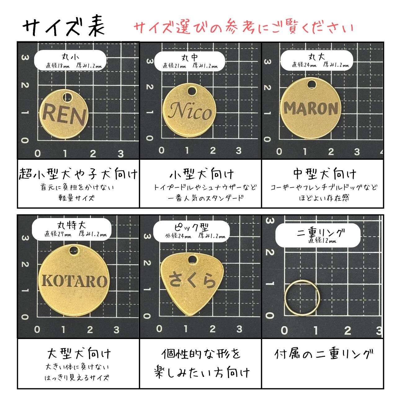 • 丸特大(直径27mm): 大型犬に。大きな体に負けない、はっきり見えるサイズ。