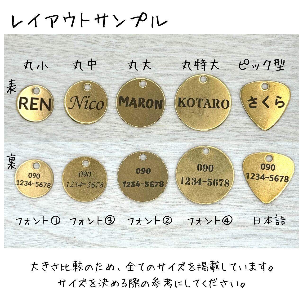 タグの表にペットのお名前(6文字まで)、裏側にオーナー様の電話番号を刻印いたします。